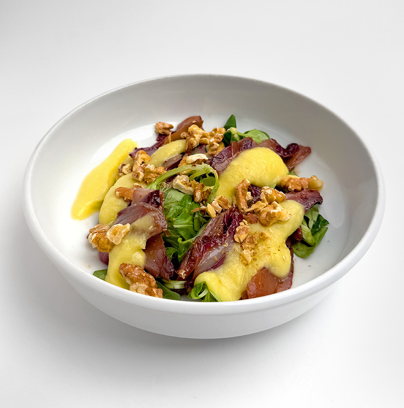 Ensalada de endivia roja y canónigos con salsa de manzana verde y nueces.