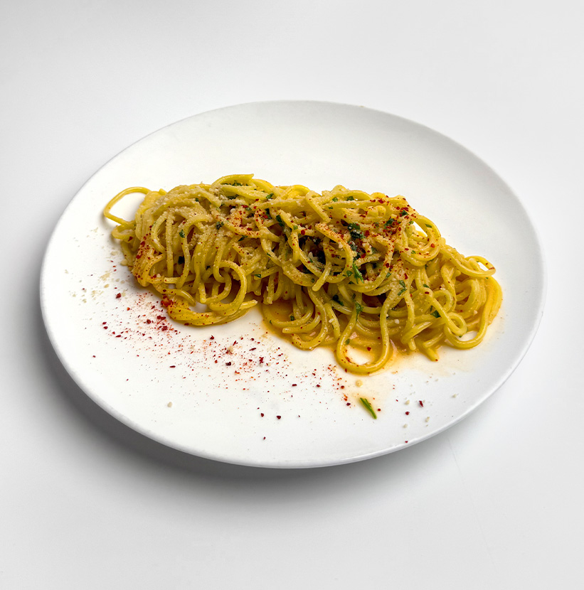 Espaguetis con ajo, aceite de oliva virgen extra y guindilla.